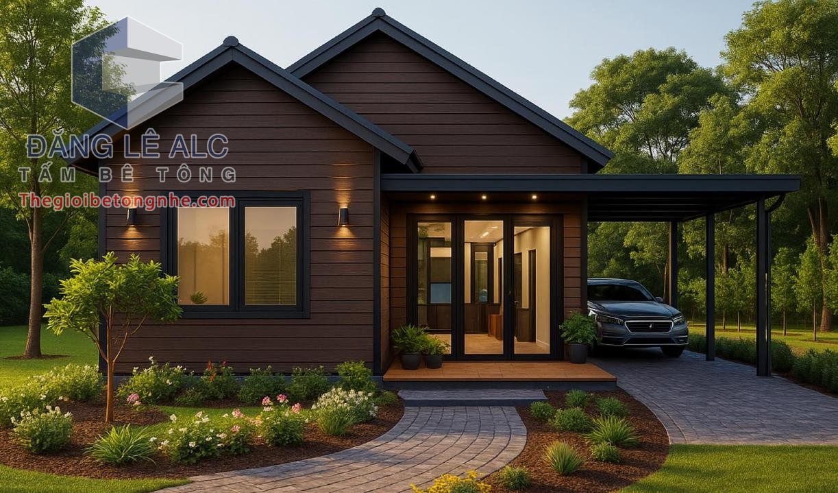 • Vật liệu: panel bê tông nhẹ EPS dày 75–100mm, khung thép mạ kẽm, mái tôn chống nóng.
